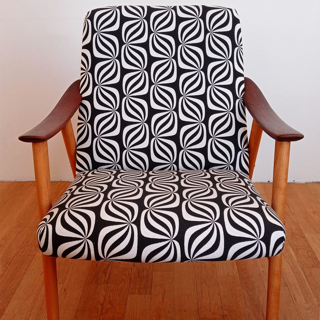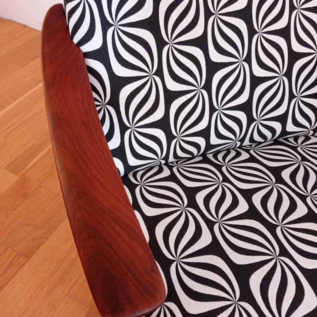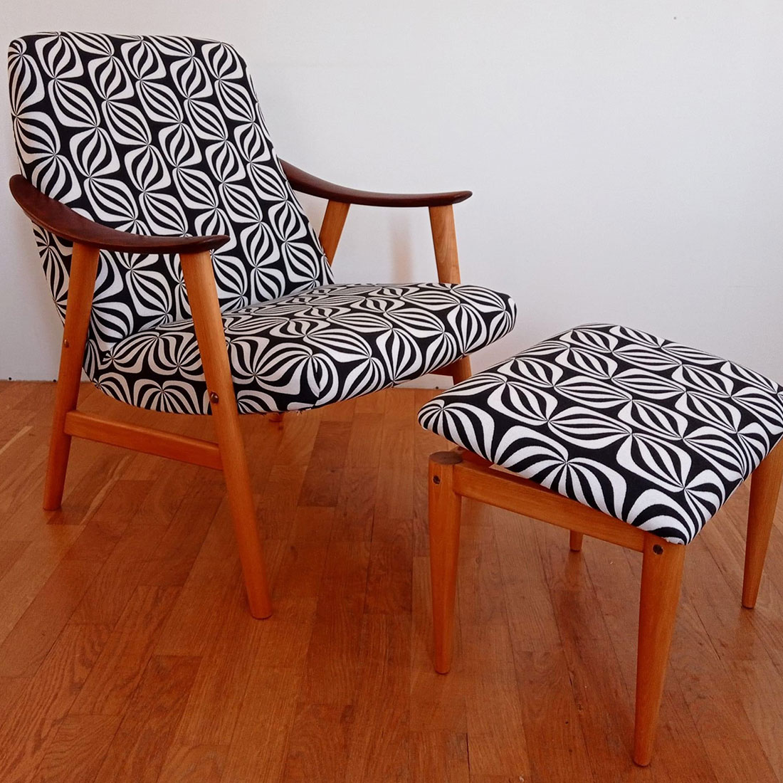 50-60ndate retro tugitool Öeldakse ju, et riie ei riku meest, aga ühele ägedale retro tugitoolile annab äge riie ikka smanti juurde küll.
