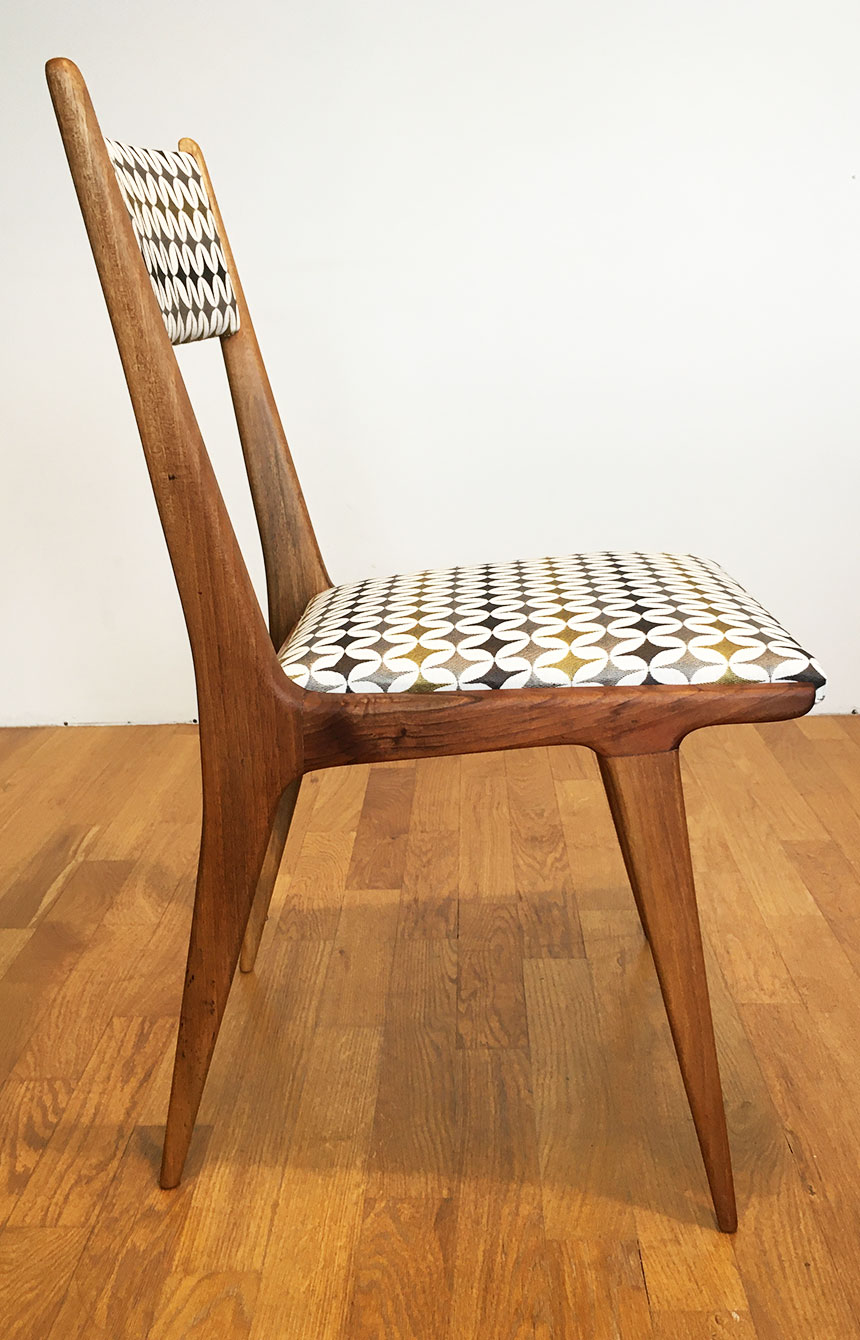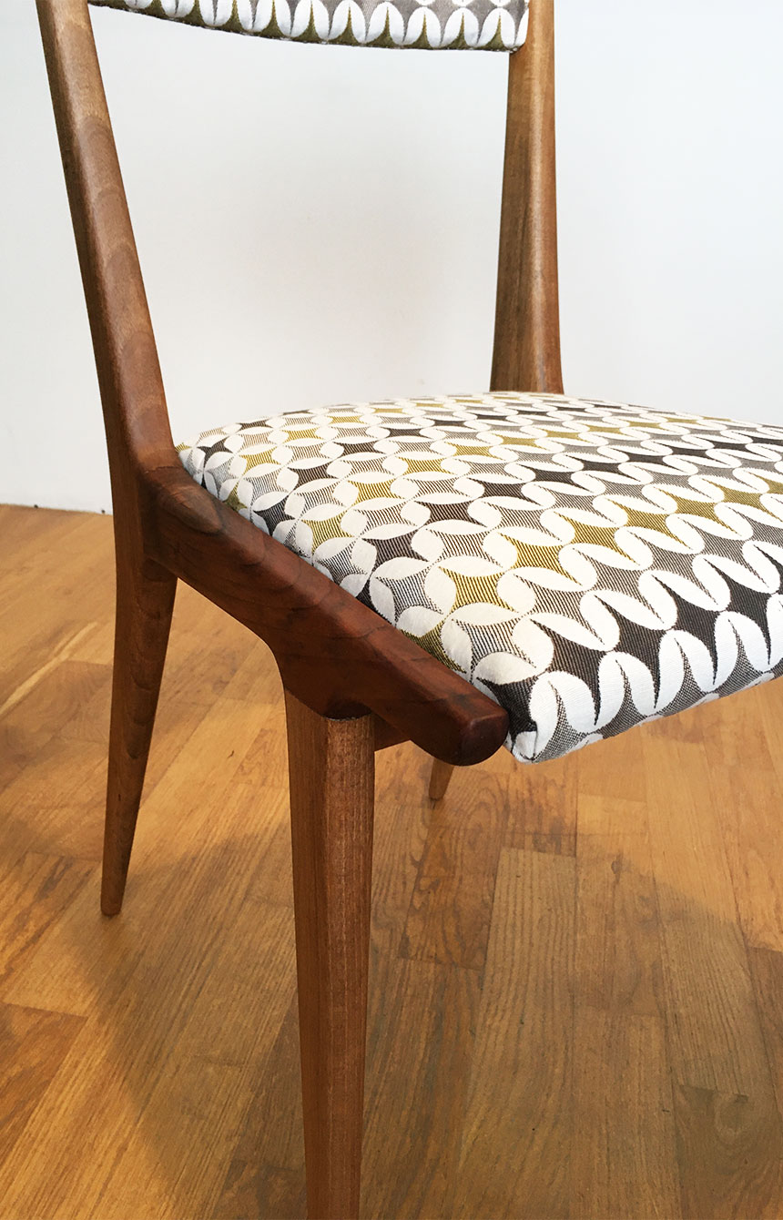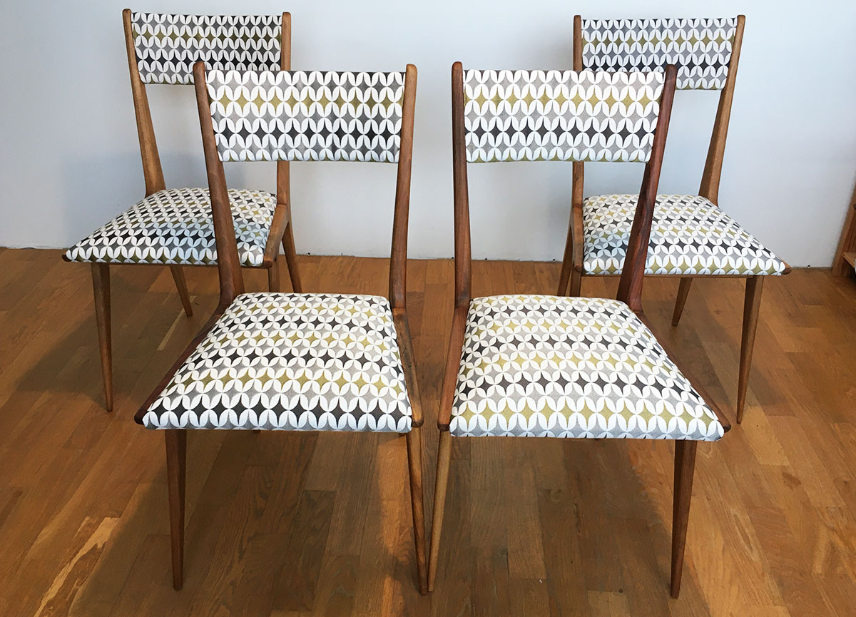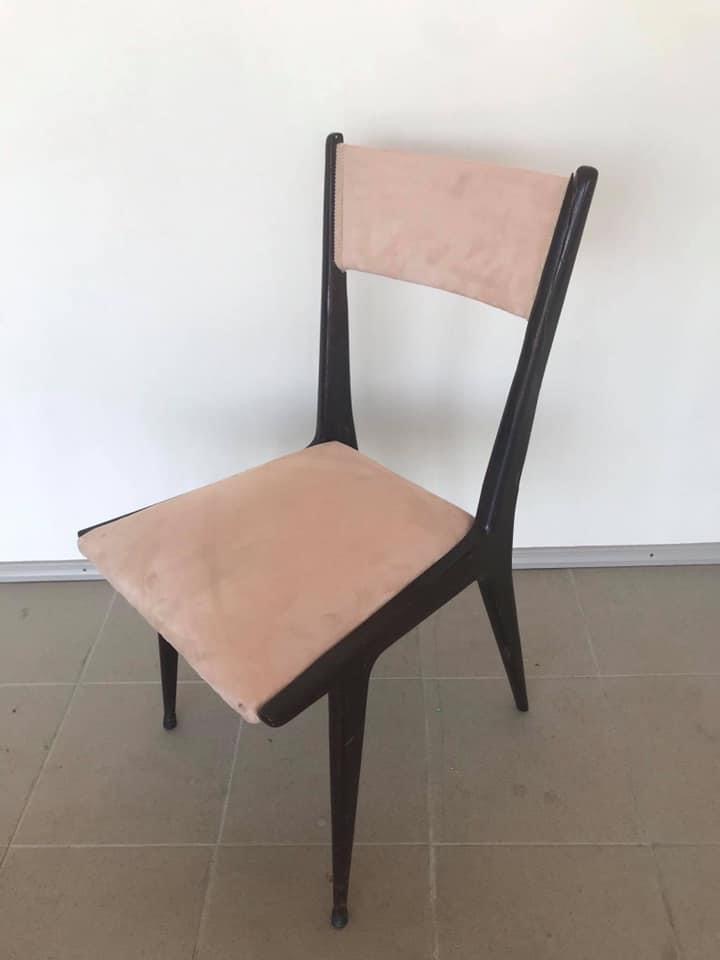 Keegi oli imeilusa joonega itaalia disaineri Silvio Cavatorta  disainitud pähklist ja pöögist toolid tumepruuniks peitsinud. Eemaldasin vana viimistluse, liimisin logisevad raamid ja õlivahatasin. Et üldmuljet ühtlustada, siis 2 pöögist tooli vahatasin pähkli tooni õlivahaga.