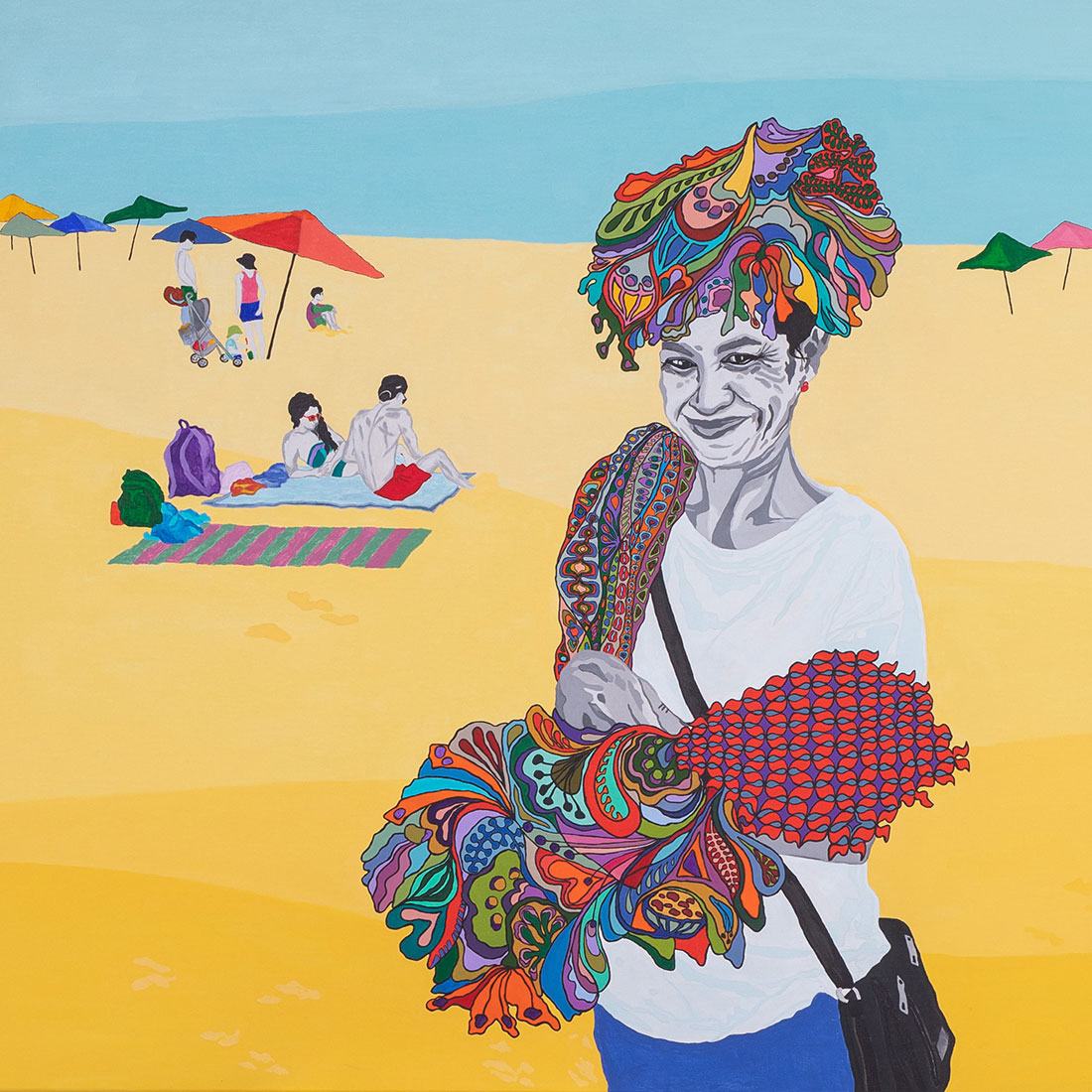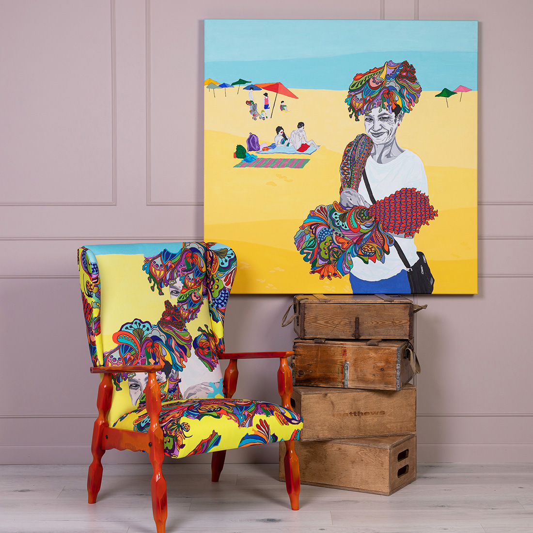 "Käepaela müüja Bali rannal" akrüül lõuendil 120x120cm ja tugitool "Puhkus 2"